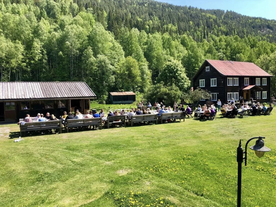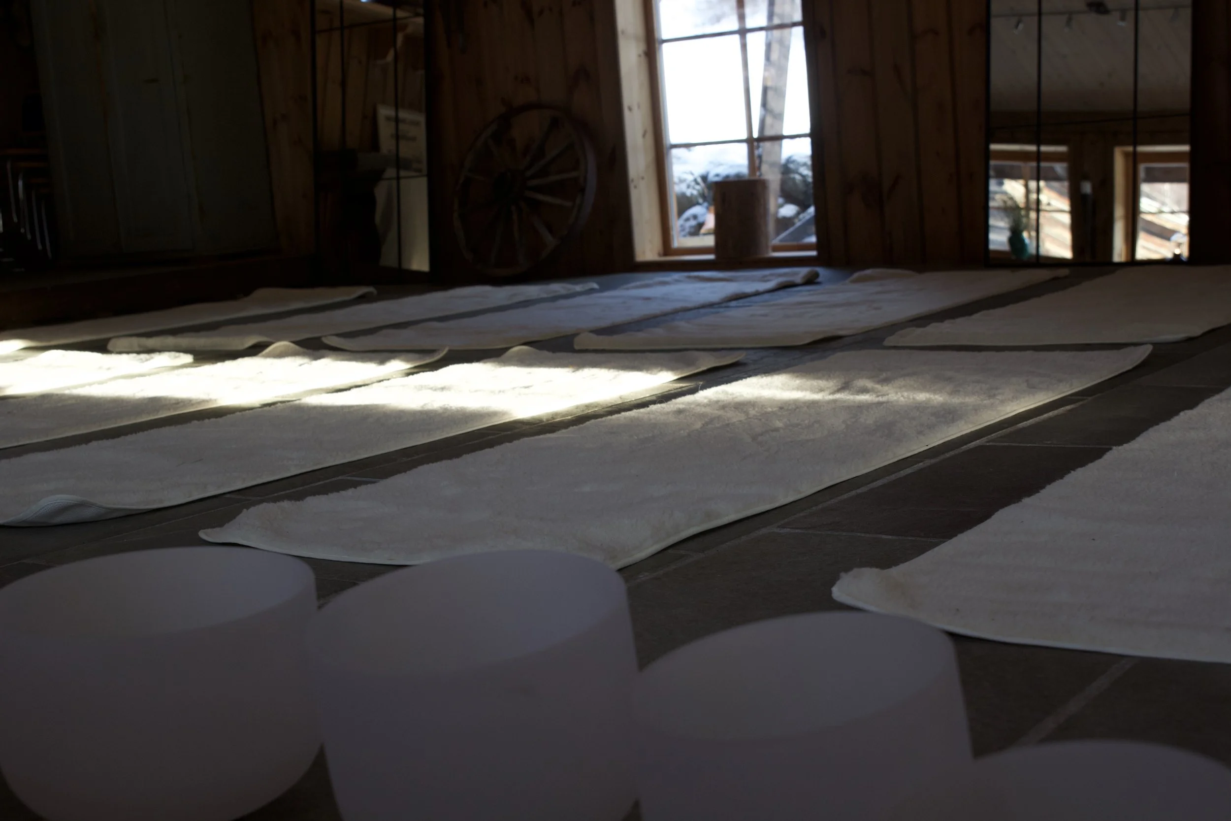 Nordsalen er et rustikt og lunt lokale på 90 m2. Utsikt ut mot tunet og to doble dører som kan åpnes ut mot det store grønne tunet. Gulve er av skifer- og eikegulv, med vannbåren gulvvarme. Lokalet har plass til ca. 24 matter og har naturlig god akustikk.